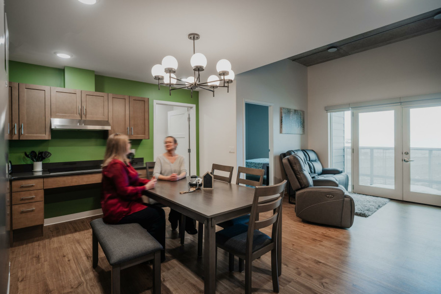 Trauma-informed design is an emerging concept, and one that we are passionate about developing. The Stepping Stones Crisis Centre, funded by CMHC, is net-zero ready and serves as a safe and calm high-security environment that embraces choice, privacy, and connection, while allowing for passive supervision. The Crisis Centre accommodates users' psychological and spiritual needs by providing a secured outdoor healing garden, landscape design that follows the principles of CPTED (Crime Prevention Through Environmental Design), and an open floor plan that allows for flow and movement while also ensuring the protection of residents' privacy and dignity.