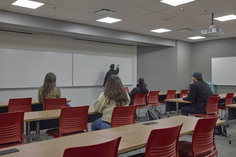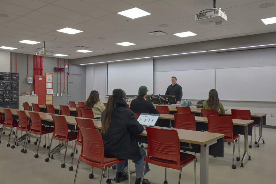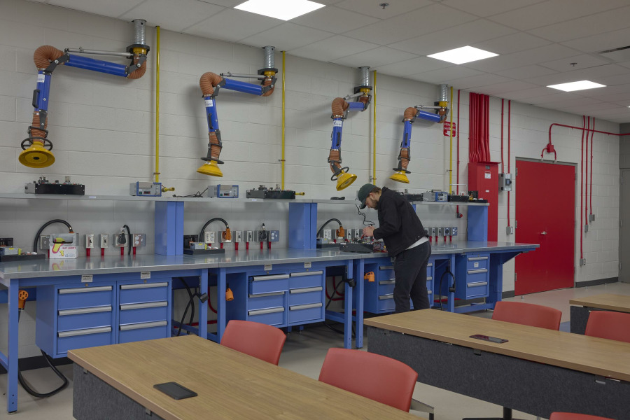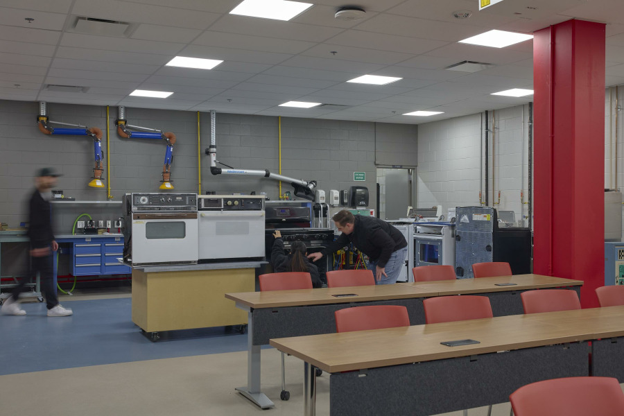 The design pays homage to the Electrical Trades Program by drawing inspiration from electrical concepts. Just as a line diagram illustrates how an electrical system comes together, the design approach integrates diverse needs into a cohesive system—one that energizes the space and inspires those who teach, learn, and collaborate within it.