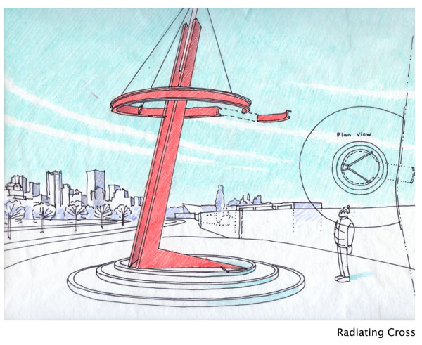 The Memory Circle, the central element of the memorial, encapsulates in its area the original traditional aboriginal burial ground and Fort Edmonton cemetery. The circle of granite plinths is "broken", acknowledging that there are still burial sites and sacred ground beyond the current site and that the work is not yet complete. The circle opens to the four cardinal directions and designates a common ground, referencing the medicine wheel, healing and symbology of many First Nations and indigenous communities. The “light spears” that surround the circle reference the ‘marking’ of the territory by the Blackfoot people.